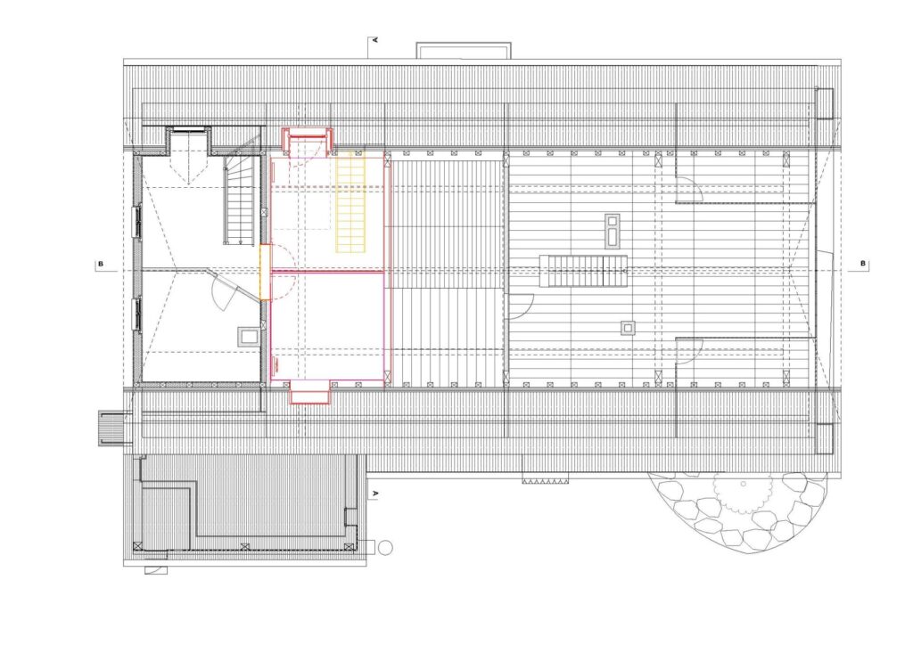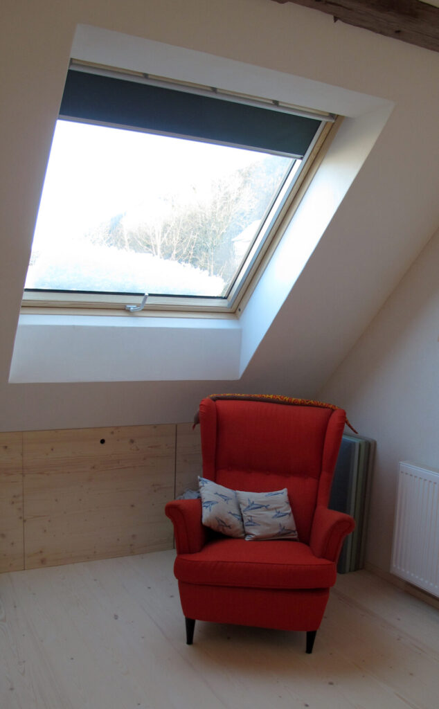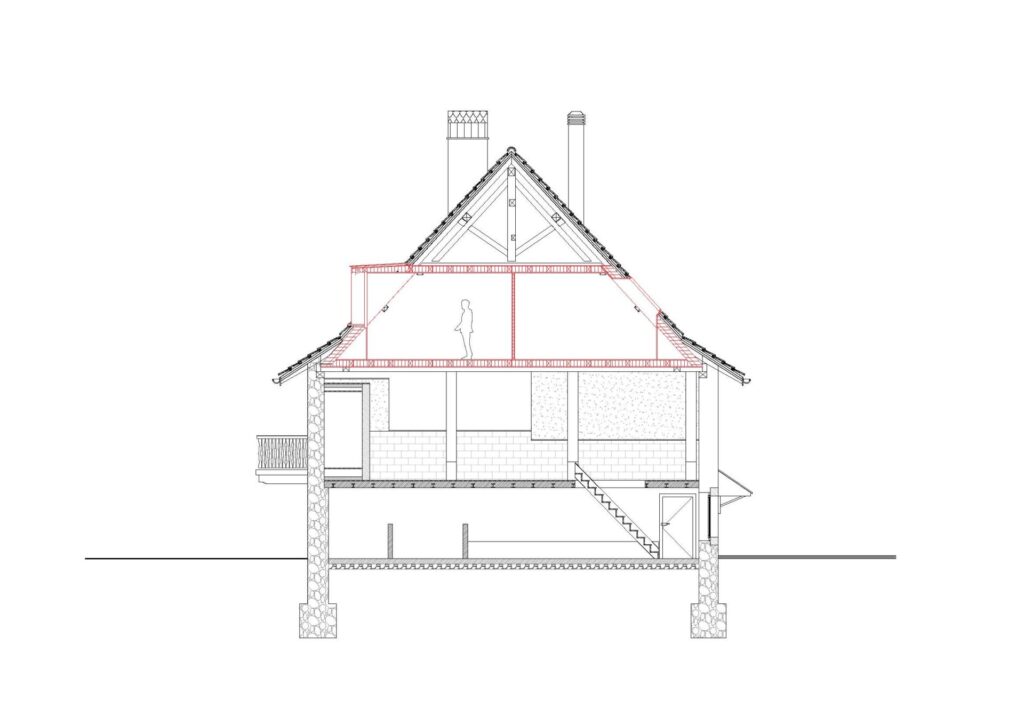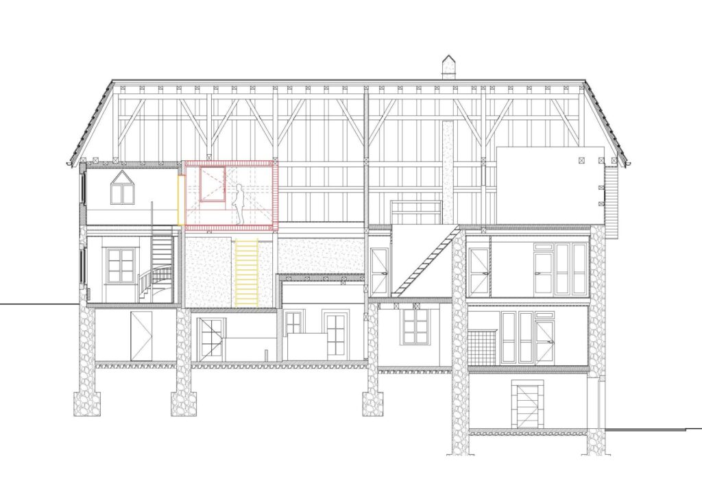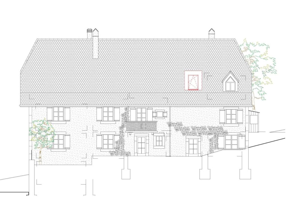 Lโextension consiste en la construction de 2 nouvelles chambres sous la toiture dans le volume imposant de lโancienne grange datant du XVII รจme siรจcle. Au sud, une gรฉnรฉreuse lucarne amรจnera la vue sur le paysage environnant et dialoguera avec lโouverture existante.