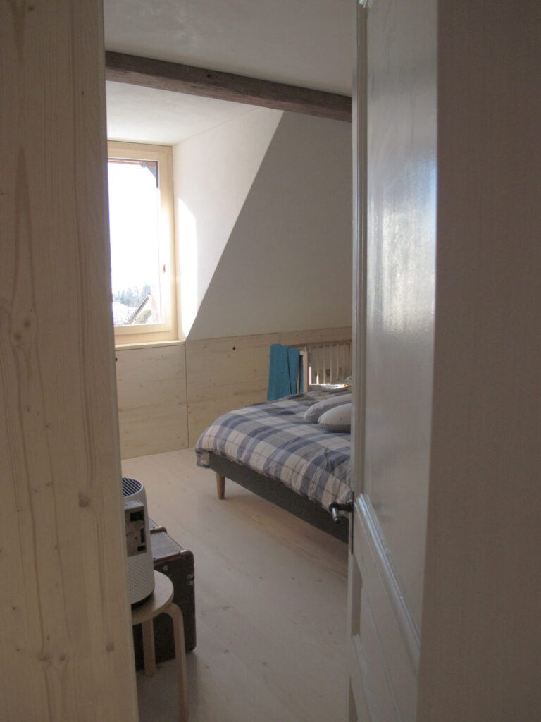 Le choix des matรฉriaux respecte lโenvironnement et la santรฉ des habitants. La charpente du nouveau volume est construite en bois massif et une isolation ร base de fibres dโherbe constituent la nouvelle enveloppe thermique. Les menuiseries intรฉrieures sont rรฉalisรฉes en sapin huilรฉ, les portes intรฉrieures sont rรฉemployรฉes dโun et proviennent dโun bรขtiment rรฉcemment rรฉnovรฉs. Les enduits intรฉrieurs sont rรฉalisรฉs ร base de chaux et de sable jaune du jura pour une atmosphรจre particuliรจre