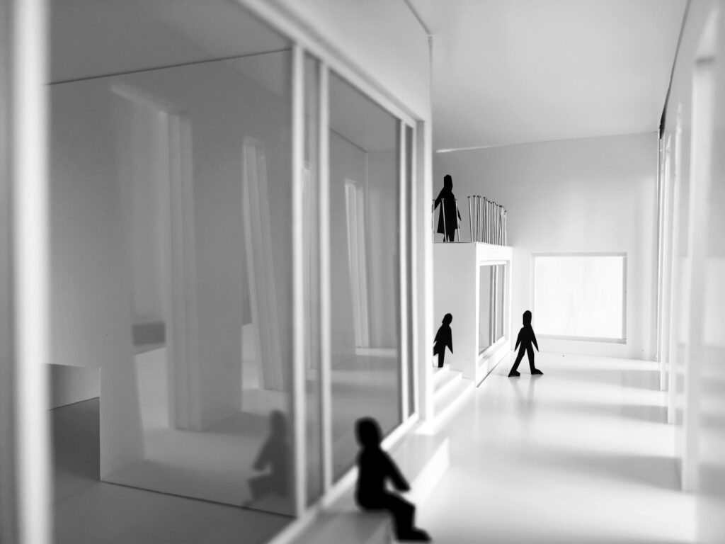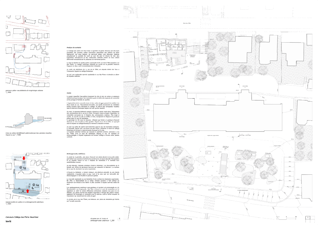 Le projet requalifie l’axe piéton traversant le site organisé en quatre paliers successifs. Il met en scène un parcours architectural qui souligne le caractère accueillant de l’école à travers des espaces de rencontre et de partage pour les habitants du quartier.