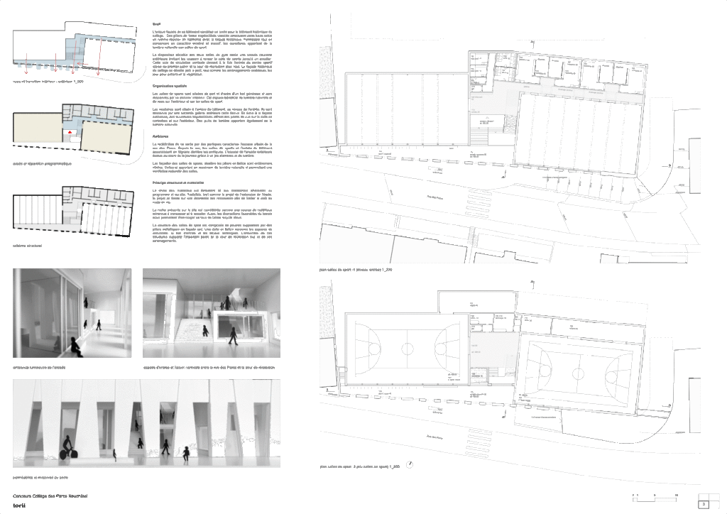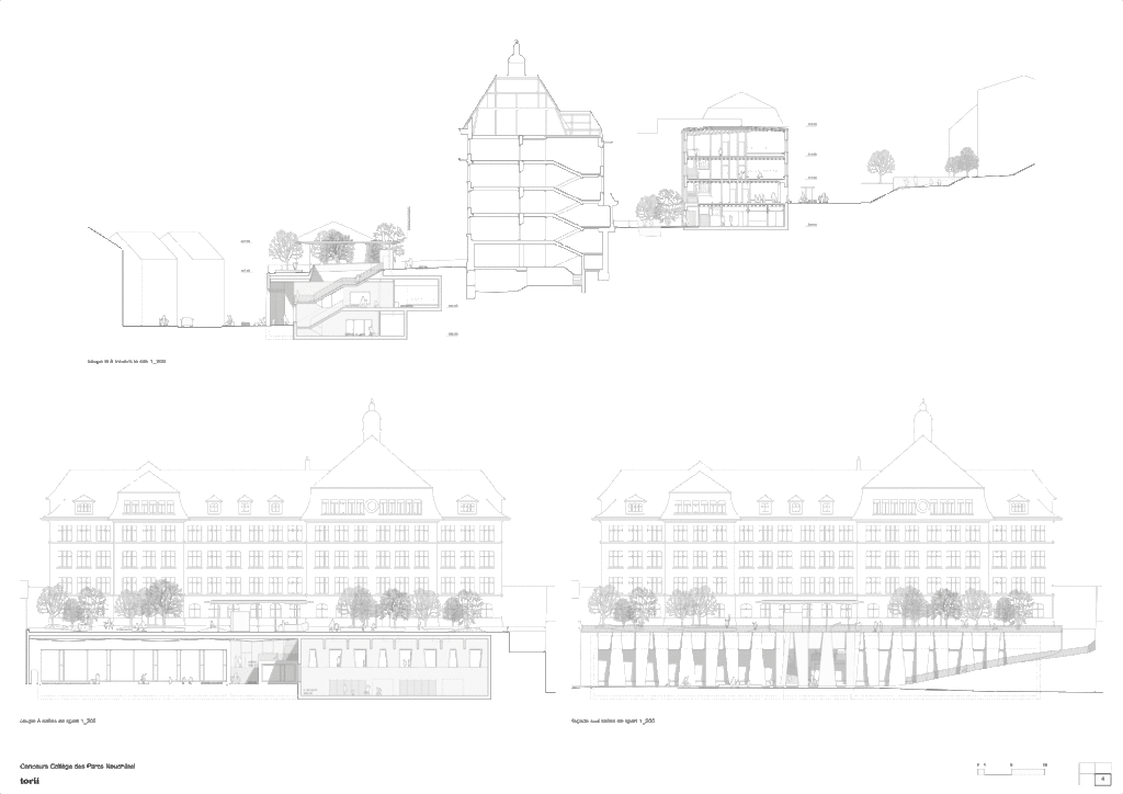 Au Sud, l’unique façade des salles de sports constitue un socle pour le bâtiment historique du collège. La redéfinition de ce socle par des portiques caractérise l’espace urbain de la rue des Parcs.