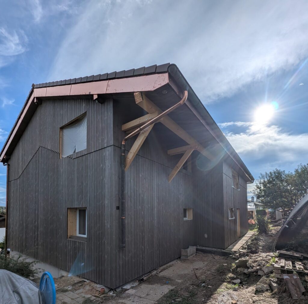 Réemploi de la charpente et des tuiles de la toiture existante et d’éléments en bois pour l’ossature des murs.
